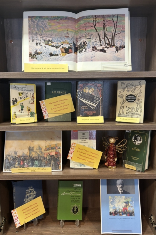 В Библиотечно-информационном комплексе открылась выставка «Широкая Масленица». Ознакомиться с экспозицией можно в библиотеке по адресу: Москва, Ленинградский проспект, 51, корпус 1, медиатека, комн. 0117.1. Цель выставки - познакомить читателей с художественными произведениями русской и современной литературы, в которых описываются или упоминаются традиции празднования Масленицы. Масленица - это один из самых веселых, ярких праздников в России, который каждый год ожидают как дети, так и взрослые. Праздничная неделя каждый год начинается в разное время, даты праздничного гулянья зависят от времени проведения Пасхи и проходят за 7 дней до начала Великого поста. Свое этимологическое значение праздник «Масленица» несет от православного maz-slo, что дословно означает мазать. В данном случае речь идет о мазание маслом праздничных блинов, ведь по православному обычаю в эту неделю мясо уже не присутствует в рационе питания перед великим постом, а молочные продукты были допустимы. Масленица – самый сытный народный праздник, который длится целую неделю. Масленица представляет собой народное гулянье. Все обычаи праздника направлены на «пробуждение» природы ото сна и подготовку верующих к Великому посту. Эту неделю встречали с песнями и плясками на городских площадях. Символом праздника считается масленичное чучело, которое люди самостоятельно изготавливают из подручных средств и наряжают как барыню. У древних славян чучело воплощало богиню Морену - покровительницу мороза, стужи и ночи. Кульминацией масленичных гуляний является сожжение установленного в центре площади чучела, символизирующего уход зимы. Именно ритуал сожжения воспринимается как некий языческий обряд сжигания богини мрака и холода, отделяя Масленицу от православного календаря и воспринимается как игра и традиционное веселье. Масленичная неделя в народе именуется как «барыня Масленица, широкая, честная, весёлая госпожа Масленица». На выставке представлена художественная и научно-популярная литература из фонда библиотеки. Сюжеты произведений А. Чехова, М. Зощенко, А. Аверченко, И. Бунина и других русских писателей связаны с празднованием Масленицы. Самый яркий литературный образ Масленицы создал русский писатель И. С. Шмелёв. В его повести «Лето Господне» есть целая глава, посвящённая этому празднику. В ней автор описал свои детские впечатления. В изобразительном искусстве русские художники посвятили народному празднику картины: Константин Маковский «Народное гуляние вовремя Масленицы на Адмиралтейской площади в Петербурге», Василий Суриков «Взятие зимнего городка». Борис Кустодиев не раз обращался к теме Масленицы. И Бог на небе, за звёздами, с лаской глядел на всех: Масленица, гуляйте!