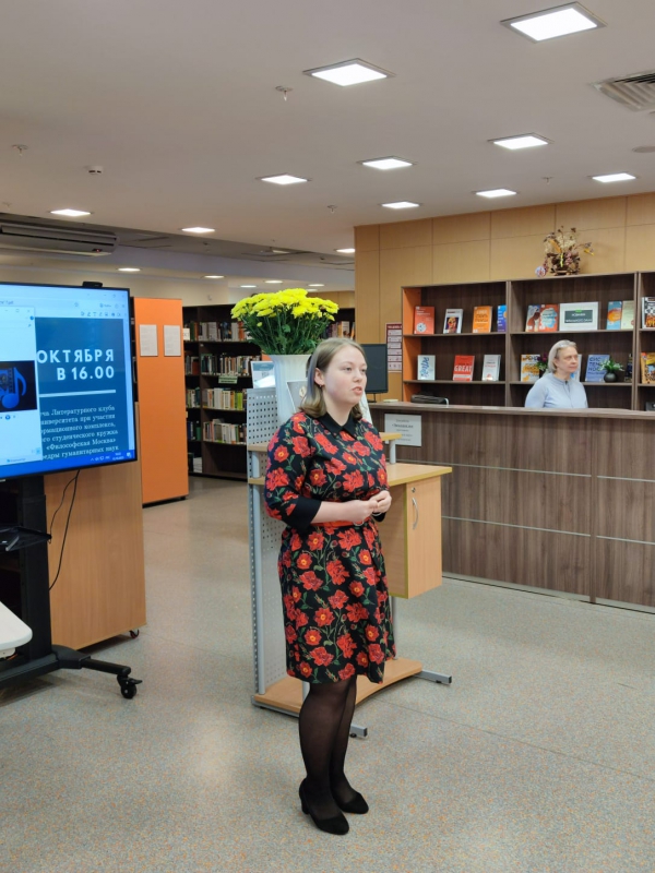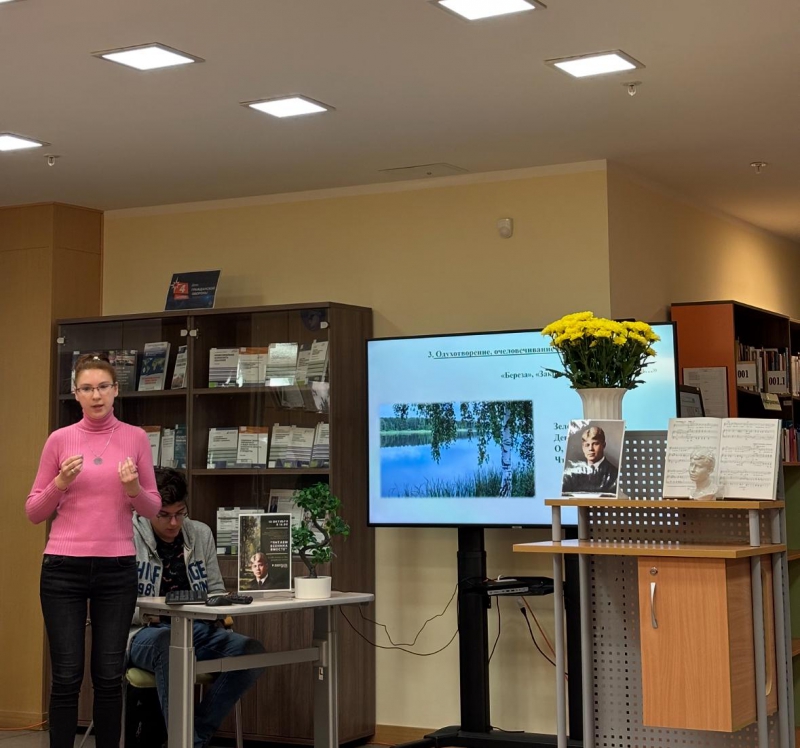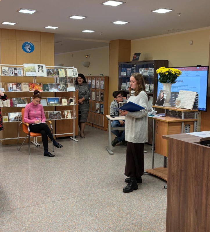 15 октября 2025 г. двери Литературного клуба Финансового университета вновь открылись для почитателей творчества выдающегося русского поэта Сергея Александровича Есенина. Мероприятие было приурочено к 130-летию со дня рождения поэта и организовано Библиотечно-информационным комплексом и Кафедрой гуманитарных наук Факультета социальных наук и массовых коммуникаций. Как отметила Евгения Сергеевна Бужор (руководитель научного студенческого кружка «Философская Москва», доцент Кафедры гуманитарных наук Факультета социальных наук и массовых коммуникаций), обращаясь с приветственным словом к аудитории: «Сегодня встреча посвящена творчеству великого русского поэта: поэта любви, поэта русской природы, которому исполнилось 130 лет со дня рождения. Это коллаборация Литературного клуба и Кафедры гуманитарных наук, в которой принимают участие студенты, аспиранты, преподаватели, сотрудники Библиотечно-информационного комплекса». Далее Диана Борисовна Ермилова (заместитель директора Библиотечно-информационного комплекса) отметила значимость поэзии С. Есенина и обратилась с напутствием к студентам, чтобы и в дальнейшем они продолжали открывать для себя творчество поэта. Наталья Анатольевна Ореховская (заведующий Кафедрой гуманитарных наук Факультета социальных наук и массовых коммуникаций): «Есенин входит в нашу жизнь в начальной школе простыми и понятными стихотворениями, которые остаются в памяти. На протяжении жизни мы к ним возвращаемся. Становимся старше – стихи меняются: про любовь - глубже, про Родину - шире, о природе - с тонкой интимной стороны. Получается, с этим поэтом мы проживаем всю жизнь…» Следующую часть творческого вечера открыла своим выступлением Елена Ивановна Замараева (доцент Кафедры гуманитарных наук ФСНиМК). Она подчеркнула, что Сергей Есенин «прочно входит в тройку читаемых поэтов в нашей стране среди молодежи». Она продекламировала одни из самых известных произведений поэта: «Песнь о собаке», «Шаганэ, ты моя Шаганэ…», «Заметался пожар голубой» и другие. Мастерское исполнение стихотворений получило горячий отклик со стороны слушателей. Очень красивым, нежным и запоминающимся было следующее выступление – Полины Юрьевны Суворовой (сотрудника Кафедры гуманитарных наук). Она исполнила песню на слова Сергея Есенина «Не жалею, не зову, не плачу» (музыка Г.Ф. Пономаренко). Продолжила вечер Екатерина Дмитриевна Левина (заведующий Факультетской библиотекой №4 Библиотечно-информационного комплекса) выступлением «Детские и юношеские годы Сергея Есенина». Екатерина Дмитриевна привела интересные и малоизвестные факты биографии поэта, сопровождая свое повествование цитатами из воспоминаний родных и близких Сергея Александровича и из «Автобиографии» поэта, рассказала о начале его творческого пути. Далее Екатерина Александровна Терешенкова (заведующий сектором Отдела социокультурных коммуникаций и проектной деятельности Библиотечно-информационного комплекса) раскрыла «Фольклорные мотивы, тему Родины и природы в творчестве С. Есенина». Она показала народную основу (использование фольклорных элементов), использование стилистических приемов (эпитетов, метафор, сравнений) в поэзии С.А. Есенина, рассказала, как образы Родины и природы отражаются в творчестве поэта, прочитала отрывки из стихотворени