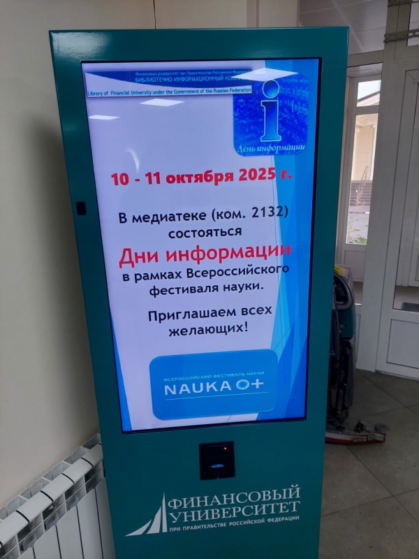 10-11 октября 2025 г. в медиатеке и коворкингах Факультета информационных технологий и анализа больших данных Финансового университета (Москва, 4-й Вешняковский проезд, д. 4, ком. 2132, 2116, 2121) прошли традиционные Дни информации для бакалавров, магистров, аспирантов, профессорско-преподавательского состава, приуроченные к Ежегодному Всероссийскому Фестивалю науки «Nauka 0+». Информация о проведении Дней информации была заранее разослана всем структурным подразделениям факультета по электронной почте и размещена в информационных киосках учебных корпусов. Программа Дней информации была очень содержательной и многообразной. Сотрудниками Библиотечно-информационного комплекса (БИК) был подготовлен открытый просмотр литературы «Наука в каждой строчке: история и современность», где помимо новой литературы об актуальных направлениях и тенденциях современной науки, были представлены редкие ретро-издания. Основным мероприятием в программе Дней информации стал семинар-тренинг «БИК - ваш помощник», на который были приглашены представители всех факультетских кафедр для совместного обсуждения форматов взаимодействия. Сотрудники библиотеки подготовили актуальную информацию по организации работы с рабочими программами дисциплин (РПД) и Конструктором РПД, приобретению новой учебной литературы, тематическим классификаторам, регистрации и предоставлению удаленного доступа к электронным ресурсам, по размещению изданий в Электронной библиотеке Финансового университета. Рассматриваемые вопросы вызвали большой интерес присутствующих. Далее по программе состоялась презентация тематической выставки «Математика-царица всех наук» (ком. 2132). Заведующий сектором Ирина Александровна Шаталова в своем обзоре через представление некоторых уникальных изданий подчеркнула всю глубину и многогранность этой науки как неотъемлемой части нашей жизни. В медиатеке и коворкинге демонстрировалась видеопрезентация «Монографии Факультета информационных технологий и анализа больших данных: от теории к практике», представляющая научные издания за 2024-2025 гг. В целях выявления заинтересованности и вовлеченности студентов в научно-исследовательскую деятельность было проведено анкетирование «Наука для всех и для меня» в бумажном и электронном виде, в котором приняли участие 44 человека. В течение двух дней сотрудники библиотеки проводили индивидуальные консультации и отвечали на вопросы. Мы благодарим всех участников и надеемся, что в эти дни наши читатели почерпнули для себя много новой и полезной информации.