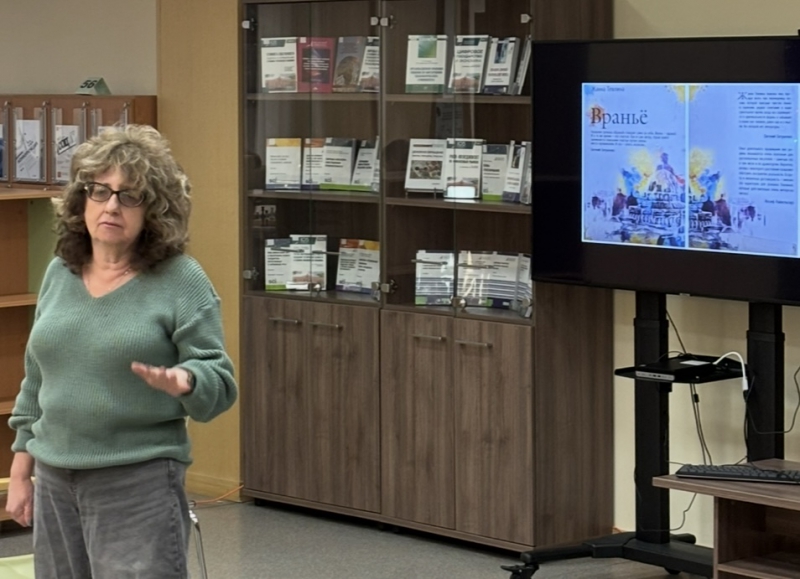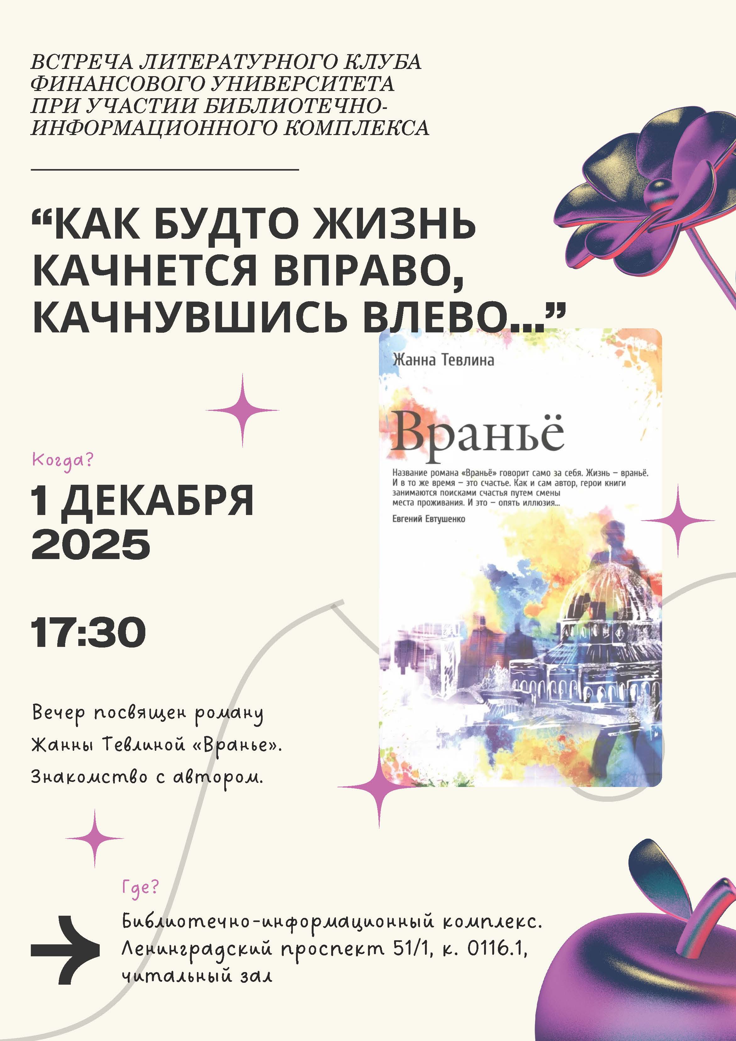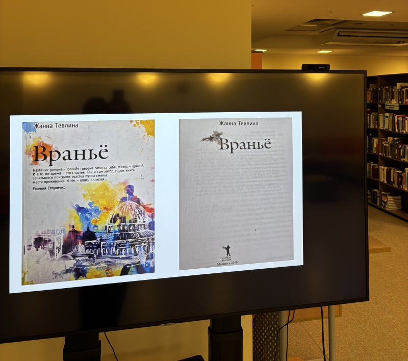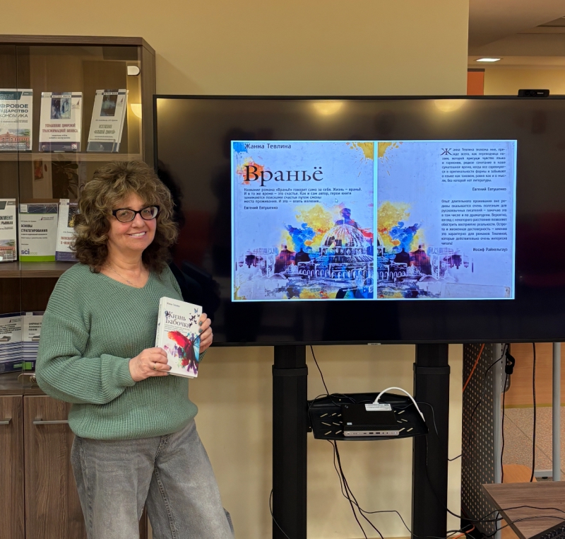 «Как будто жизнь качнется вправо, качнувшись влево...» 01 декабря 2025 г. Литературный клуб Финансового университета в очередной раз открыл свои двери. Первый день зимы у нас был теплым и душевным, в Литературный клуб Финансового университета пришла Евгения Абрамовна Ненюк, старший преподаватель Кафедры английского языка и профессиональной коммуникации. Студенты, преподаватели, сотрудники Библиотечно-информационного комплекса встретились с автором в читальном зале на Ленинградском проспекте, 51.1. Евгения Абрамовна пишет под псевдонимом Жанна Тевлина, и разговор был о её романе «Враньё». Книга вышла в издательстве «РИПОЛ классик», основанном в 1989 г. и признанном в 2024 году "Издательством года" (Премия «Ревизор»). Издание представлено в фонде художественной литературы Библиотечно-информационного комплекса Финансового университета: Тевлина, Ж. Вранье / Ж. Тевлина.-Москва : Рипол Классик, 2016 Евгения Абрамовна рассказала, как необычно, во сне появился замысел книги, насколько совпадает или не совпадает жизнь автора и героя, чем отличается хорошо написанная книга от плохо написанной. Евгения Абрамовна прочитала знаковые отрывки из своей книги, чтобы мы почувствовали легкий юмор, изящную иронию авторского языка. И можно согласиться со знаменитым поэтом Евгением Евтушенко, что нашему уважаемому автору «присущи чувство языка и гармонии, редкое сочетание в наше суматошное время, когда все соревнуются в оригинальности формы и забывают о языке как таковом, равно как и о мысли, без которой нет литературы». Евтушенко писал: «Название романа «Враньё» говорит само за себя. Жизнь – враньё. И в то же время – это счастье. Как и сам автор, герои книги занимаются поисками счастья путем смены места проживания. И это – опять иллюзия…». Вместе с автором все задались вопросами: возможно ли жить без вранья, как изменится жизнь, если не врать другим, не обманывать себя, можно ли убежать от себя, сменив место жительства? Книга открыла новый взгляд на проблемы истинных чувств к близким людям, к стране, в которой живёшь. Лирической нотой прозвучал Рождественский романс Иосифа Бродского «Как будто жизнь качнется вправо, качнувшись влево...», который стал созвучен истории жизни главного героя романа. «Твой Новый год по темно-синей волне средь моря городского плывет в тоске необъяснимой, как будто жизнь начнется снова, как будто будет свет и слава, удачный день и вдоволь хлеба, как будто жизнь качнется вправо, качнувшись влево». Евгения Абрамовна предложила провести поэтический вечер, на котором можно прочитать переводы разных авторов и собственные стихи. Ждём с радостью новой встречи с Евгенией Абрамовной и с вами, кто пишет или переводит стихи, в Литературном клубе Финансового университета!