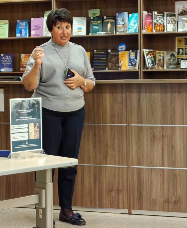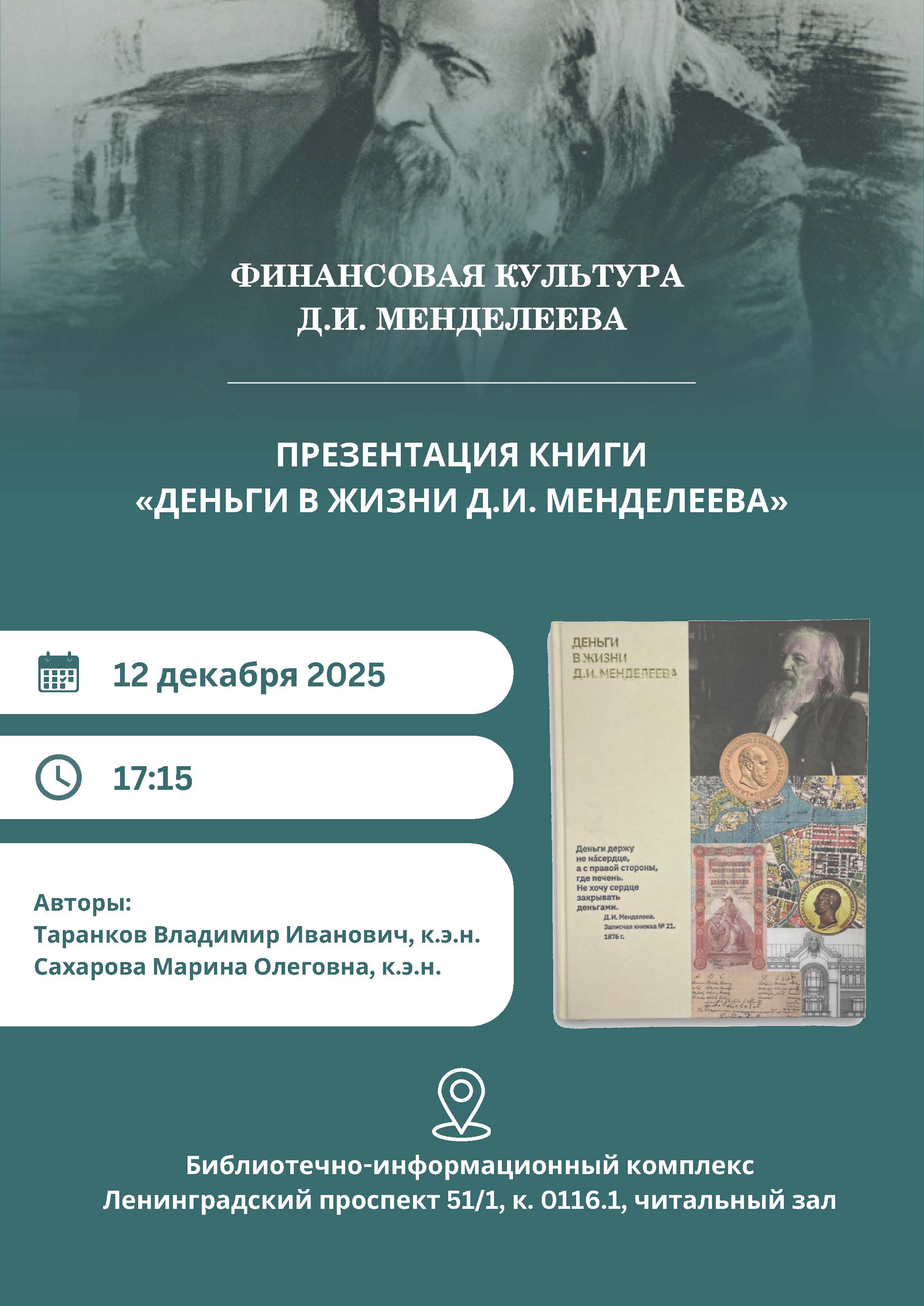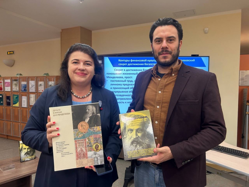 12 декабря 2025 г. в Библиотечно-информационном комплексе Финансового университета (Москва, Ленинградский проспект, д. 51, корпус 1, комн. 0116.1) состоялась презентация книги «Деньги в жизни Д.И. Менделеева» М.О. Сахаровой и В.И. Таранкова. Организаторы: -Библиотечно-информационный комплекс Финансового университета. Участники: студенты и преподаватели, Научный студенческий кружок «Философская Москва» Кафедры гуманитарных наук Факультета социальных наук и массовых коммуникаций (руководитель Бужор Евгения Сергеевна). Издание вышло в 2025 году при поддержке Финансового университета при Правительстве РФ, Факультета международных экономических отношений и Совета молодых учёных. Книгу представили ее авторы Владимир Иванович Таранков и Марина Олеговна Сахарова - экономисты, ученые, коллекционеры, выпускники Финансового университета. Открыла мероприятие Директор Библиотечно-информационного комплекса Финансового университета Татьяна Васильевна Корчагина, подчеркнув, что «в прошлом году вся страна отмечала юбилей Д.И. Менделеева - 190 лет со дня рождения ученого. Он не только талантливый человек, энциклопедист, но и экономист». Т.В. Корчагина поблагодарила авторов за передачу ценного издания в фонд Библиотечно-информационного комплекса.