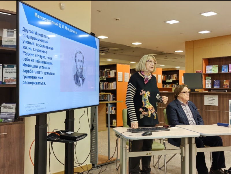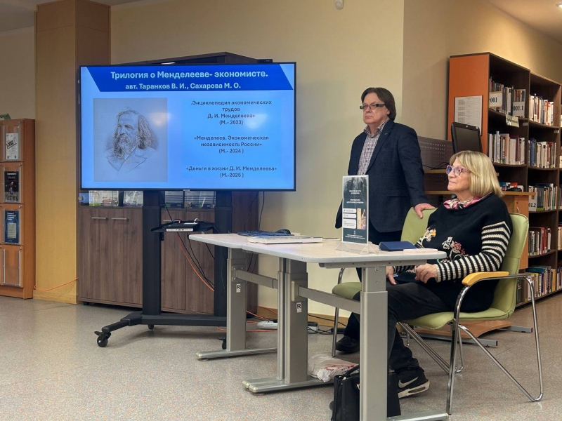 Владимир Иванович отметил, что главная цель написания трилогии научных трудов о Д.И. Менделееве – «создать гармоничный образ великого ученого не только химика, а непревзойденного экономиста». Книги трилогии: -Таранков, В.И. Энциклопедия экономических трудов Д.И. Менделеева / В.И. Таранков, М.О. Сахарова. -Москва :Бослен, 2023.-396 с. -Таранков, В.И. Менделеев: Экономическая независимость России / В.И. Таранков, М.О. Сахарова ; послесл. М.А. Эскиндаров, П.С. Селезнев.- Москва : Бослен : Русская речь, 2024.- 320 с. -Таранков В.И. Деньги в жизни Д. И. Менделеева / В.И. Таранков, М.О. Сахарова.- Москва: Бослен, 2025.-244 с. В.И. Таранков представил экономическую концепцию Д.И. Менделеева, подчеркнув, что именно Дмитрий Иванович Менделеев является создателем концепции экономического суверенитета России. В.И. Таранков рассказал о жизненном и научном пути Дмитрия Ивановича, о создании им Главной палаты мер и весов, о его педагогической деятельности, рассказал о содержании трилогии о Д.И. Менделееве, в которой детально представлены: -стратегия экономической независимости страны, предложенная ученым; -основы финансовой культуры Д.И. Менделеева: формирование на протяжении 40 лет крупного портфеля ценных бумаг; ежедневный учет собственных доходов и расходов, составление смет и планов на месяц и на год; -механизмы вложения денег (в банки, недвижимость, железные дороги, государство). Марина Олеговна рассказала о большой работе, которая была проделана при подготовке книги «Деньги в жизни Д.И. Менделеева», которая является первым трудом о создании великим ученым собственной финансовой культуры, элементы которой стали так востребованы в XXI в. Это фактически полная финансовая биография человека, который смог с нуля заработать крупное состояние. Авторы попыталась раскрыть секреты его уникального успеха: сочетание научной деятельности и обретение финансовой независимости. Ученый сумел гармонично вписать свои нравственно-духовные ценности в дело распределения личных расходов и доходов. Некоторые аспекты, которые рассмотрены в книге: