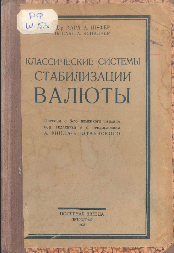 Библиотечно-информационный комплекс, раскрывая свои уникальные книжные фонды, предлагает вниманию читателей рассказы о наиболее интересных изданиях, объединенные в цикл "Книжные реликвии Библиотечно-информационного комплекса". На сайте БИК будут представлены изображения книги (фрагменты или полный текст) и эссе, раскрывающее её историю. Коллекция редких изданий БИК формировалась из частных коллекций М.И. Боголепова - советского экономиста, члена-корреспондента Академии наук СССР, организатора и первого ректора института народного хозяйства в Петрограде в 1920-1922 годах; А.М. Галагана - преподавателя Московского коммерческого института (1918); а также коллекций Департамента окладных сборов, Госкомбанка, Всероссийского кооперативного банка, Московского промышленного лицея им. А.И.Гукова. Предоставляем Вам возможность прикоснуться к уникальным изданиям XIX - XX веков и приглашаем в Зал диссертаций и книжных раритетов БИК. В этом выпуске мы хотим представить издание из фонда нашей библиотеки: Шефер, Карл А. Классические системы стабилизации валюты : пер. с 3 нем. изд. / Карл А. Шефер ; ред. и предисл. А. Финн-Енотаевского, премирована факультетом экономических и социальных наук Кельнского университета.-Петроград : Полярная звезда, 192 с. и рассказать о книге и ее авторе. С электронной версией издания можно ознакомиться в Электронной библиотеке Финансового университета. Карл Антон Шефер (19 июня 1890 - 29 января 1974)- немецкий финансист и политик. Родился в семье торговца Карла Шефера и его жены Гертруды Шуберт. После получения аттестата в 1909-1911 годах посещал Высшую торговую школу в Кёльне. В 1913 году защитил диссертацию во Фрайбургском университете на тему «Цели и пути младотурецкой экономической политики». До 1915 года работал служащим в акционерном обществе «Дойче Петролеум», впоследствии руководил Центральным германо-турецким экономическим комитетом в Берлине. Специалист по экономике и хозяйству Османской империи, автор многочисленных публикаций по данной тематике. Участник Первой мировой войны, рядовой.