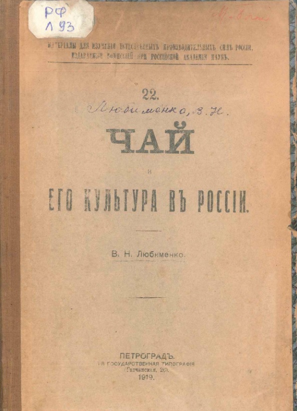 В этом выпуске мы хотим представить издание из фонда нашей библиотеки: Любименко, В.Н. Чай и его культура в России / В.Н. Любименко.- Петроград : 1-я государственная типография, 1919.-79 с. и рассказать о книге и ее авторе. С электронной версией издания можно ознакомиться в Электронной библиотеке Финансового университета. Владимир Николаевич Любименко (4 [16] января 1873, с. Вейделевка, Воронежская губерния — 14 сентября 1937, Ленинград) — русский советский ботаник, специалист в области физиологии растений, член-корреспондент РАН (с 1922, АН СССР с 1925) и действительный член АН УССР (с 1929). Родился в семье мелкого служащего. Начальное образование получил уездном училище г. Новый Оскол, затем поступил в Харьковское земледельческое училище, в котором благодаря отличным успехам учился на казённый счёт. После окончания училища (1892) работал агрономом в одном из имений Полтавской губернии. В 1894 году поступил в Петербургский лесной институт. Здесь ботанику преподавал профессор И. П. Бородин, под влиянием которого решил заняться ботаникой. В 1898 году окончил Лесной институт с золотой медалью за сочинение «Об отложении кристаллов щавелевокислого кальция в органах цветка». По окончании института он был оставлен для подготовки к профессорскому званию по кафедре лесоводства (1899—1900), но увлечение ботаникой заставило его перейти на кафедру ботаники в качестве исполняющего обязанности ассистента. Поскольку, согласно существовавшему тогда положению, должность ассистента по этой кафедре могли занимать только лица с университетским образованием, Любименко в 1900 году поступил вольнослушателем в Петербургский университет. В 1902 году сдал экстерном государственные экзамены, получил диплом I степени и в этом же году был утверждён в должности ассистента по кафедре ботаники Лесного института. В 1903 году уехал в научную командировку за границу в Бонн, где работал в лаборатории Страсбургера, изучая деление ядер в материнских клетках пыльцы и зародышевых мешках у нимфейных. В 1904 году в Париже в лаборатории Боннье начал работы по фотосинтезу, которые в дальнейшем стали основной темой его научных исследований. В 1905 году перешёл на работу в Лесной департамент, который направил его в трёхгодичную командировку во Францию для научных исследований по проблеме светолюбия и теневыносливости древесных пород. В 1908 году назначен на должность ботаника Никитского ботанического сада в Крыму, где проработал до конца 1913 года. В 1909 году сдал в Харьковском университете магистерские экзамены, а в 1910 защитил в Петербургском университете магистерскую диссертацию на тему «Содержание хлорофилла в хлорофильном зерне и энергия фотосинтеза». За научные труды по изучению хлорофилла Академия наук присудила Любименко Бёйтензоргскую стипендию — на научное путешествие в тропические страны. В 1913 году отправился в это путешествие и посетил Австралию, Новую Зеландию, острова Малайского архипелага. В Бёйтензоргском ботаническом саду на острове Ява он занялся обширными исследованиями по хлорофиллу. Из тропиков им были привезены коллекции образцов растений и животных, которые он передал в Ботанический институт, Зоологический музей Академии наук и в Никитский ботанический сад.