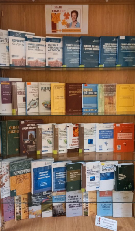 В Библиотечно-информационном комплексе открылась выставка к юбилею Марины Алексеевны Федотовой. С экспозицией можно ознакомиться в библиотеке по адресу: Москва, ул. Кибальчича, д.1, 2 этаж. холл. Марина Алексеевна Федотова - доктор экономических наук, профессор, заместитель научного руководителя Финансового университета, профессор Кафедры корпоративных финансов и корпоративного управления Факультета экономики и бизнеса, Главный научный сотрудник Института финансово-промышленной политики Факультета экономики и бизнеса. Марина Алексеевна является одним из первых российских ученых в области оценочной деятельности, автором и соавтором учебников и учебных пособий по оценочной деятельности, научных монографий и большого количества статей в периодической печати. М.А. Федотова - Лауреат Премии Президента Российской Федерации в области образования (2000). Удостоена Благодарности Президента Российской Федерации, Заслуженный экономист Российской Федерации (Указ Президента РФ от 25.01.2002), «Почетный работник высшего профессионального образования РФ», Ординарный профессор Финансового университета, имеет нагрудный знак «Почетный работник Финансовой академии». Награждена Орденом Почета и медалями. На выставке представлены монографии и учебные издания, подготовленные Мариной Алексеевной, которые уже много лет являются основополагающими изданиями для подготовки оценщиков в Финансовом университете и во многих крупнейших вузах страны. Библиографический указатель научных трудов М.А. Федотовой