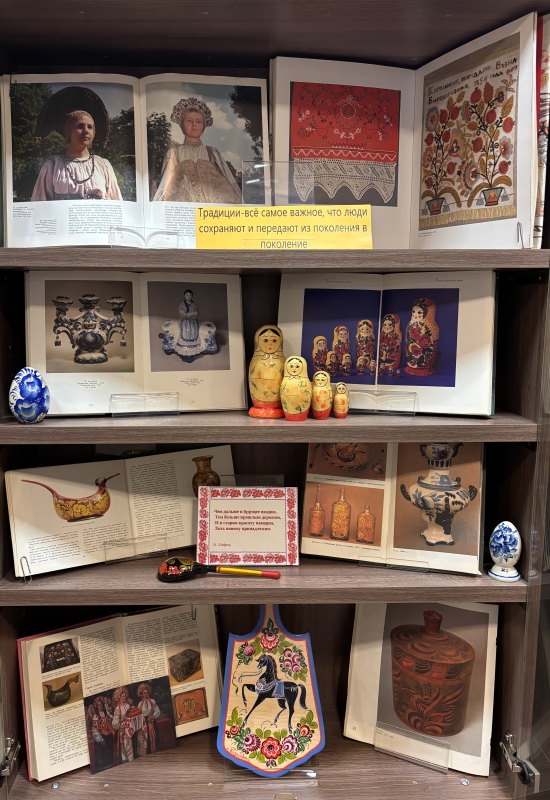 В Библиотечно-информационном комплексе открылась выставка «Живая нить традиций». Ознакомиться с экспозицией можно в библиотеке по адресу: Москва, Ленинградский проспект, 51, корпус 1, медиатека, комн. 0117.1. Цель выставки – способствовать формированию интереса к истории Отечества, напомнить о важности сохранить и передать все лучшие духовно-нравственные качества следующим поколениям. Экспозицию составляют книги по истории России, классика русской литературы, деревенская проза, современная российская проза, поэзия, альбомы по народному декоративно-прикладному искусству. Один из разделов выставки посвящен народно-прикладному творчеству. В нем собраны книги и альбомы русского народного творчества: гжель, хохлома, городецкая роспись, русская вышивка. Выставка оформлена предметами народно-прикладного творчества: русские матрешки, деревянные ложки в стиле хохломской росписи, декоративная доска с городецкой росписью, фигурки, расписанные в технике гжель. На протяжении многих веков наше общество воспитывалось и развивалось в неизменных нравственных ценностях: духовность, трудолюбие, сострадание, доброта, совесть, любовь к Родине. В произведениях классиков русской литературы и современных авторов художественной литературы, представленных в экспозиции, обращается внимание на сложность отношений человека с обществом, на непреходящие ценности духовных традиций. "Высшая и самая характерная черта нашего народа — это чувство справедливости и жажда ее" /Достоевский Ф.М./ "Родина больше нас. Сильней нас. Добрей нас. Сегодня ее судьба вручена нам – будем же ее достойны" /Распутин В.Г./ "Знание прошлого Отечества делает человека богаче, духом, тверже характером и умнее разумом" /Пикуль В.С./