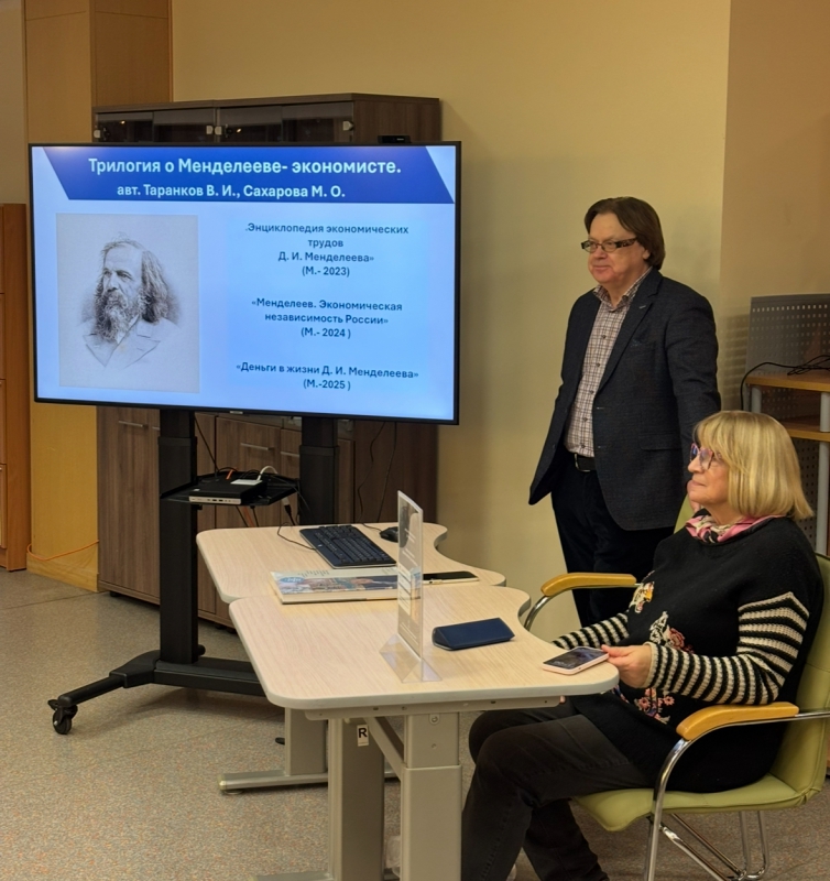 Владимир Иванович отметил, что главная цель написания трилогии научных трудов о Д.И. Менделееве – «создать гармоничный образ великого ученого не только химика, а непревзойденного экономиста». Книги трилогии: -Таранков, В.И. Энциклопедия экономических трудов Д.И. Менделеева / В.И. Таранков, М.О. Сахарова. -Москва :Бослен, 2023.-396 с. -Таранков, В.И. Менделеев: Экономическая независимость России / В.И. Таранков, М.О. Сахарова ; послесл. М.А. Эскиндаров, П.С. Селезнев.- Москва : Бослен : Русская речь, 2024.- 320 с. -Таранков В.И. Деньги в жизни Д. И. Менделеева / В.И. Таранков, М.О. Сахарова.- Москва: Бослен, 2025.-244 с. В.И. Таранков представил экономическую концепцию Д.И. Менделеева, подчеркнув, что именно Дмитрий Иванович Менделеев является создателем концепции экономического суверенитета России. В.И. Таранков рассказал о жизненном и научном пути Дмитрия Ивановича, о создании им Главной палаты мер и весов, о его педагогической деятельности, рассказал о содержании трилогии о Д.И. Менделееве, в которой детально представлены: -стратегия экономической независимости страны, предложенная ученым; -основы финансовой культуры Д.И. Менделеева: формирование на протяжении 40 лет крупного портфеля ценных бумаг; ежедневный учет собственных доходов и расходов, составление смет и планов на месяц и на год; -механизмы вложения денег (в банки, недвижимость, железные дороги, государство). Марина Олеговна рассказала о большой работе, которая была проделана при подготовке книги «Деньги в жизни Д.И. Менделеева», которая является первым трудом о создании великим ученым собственной финансовой культуры, элементы которой стали так востребованы в XXI в. Это фактически полная финансовая биография человека, который смог с нуля заработать крупное состояние. Авторы попыталась раскрыть секреты его уникального успеха: сочетание научной деятельности и обретение финансовой независимости. Ученый сумел гармонично вписать свои нравственно-духовные ценности в дело распределения личных расходов и доходов. Некоторые аспекты, которые рассмотрены в книге: