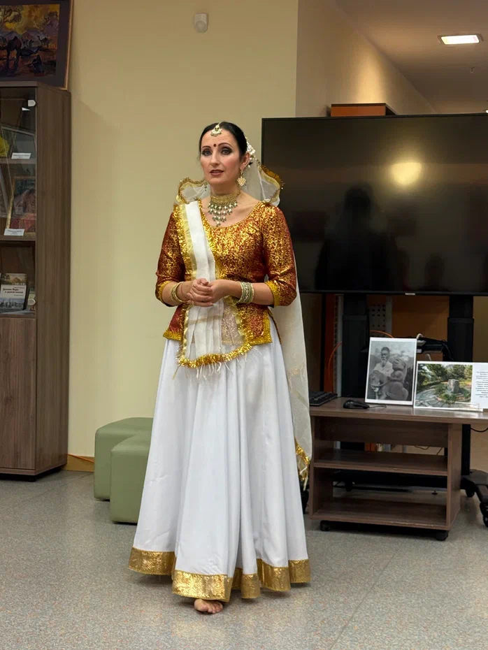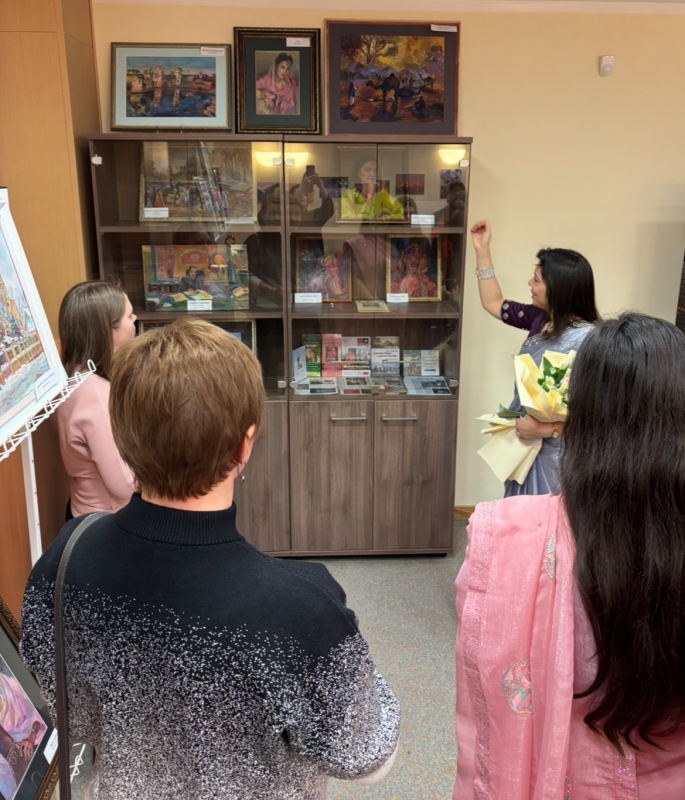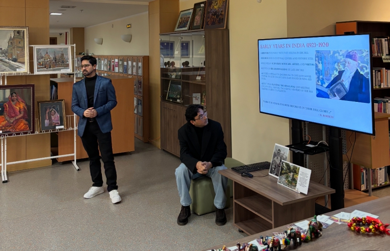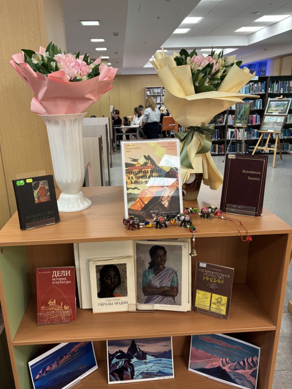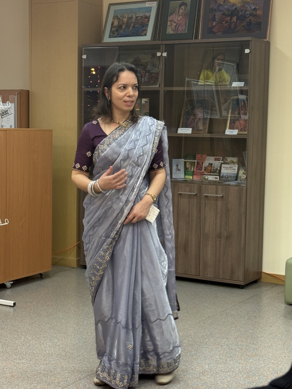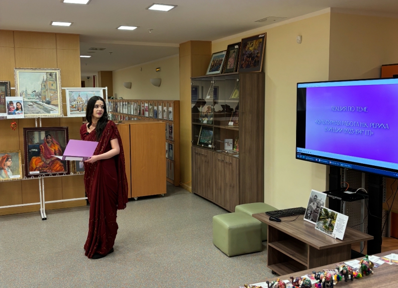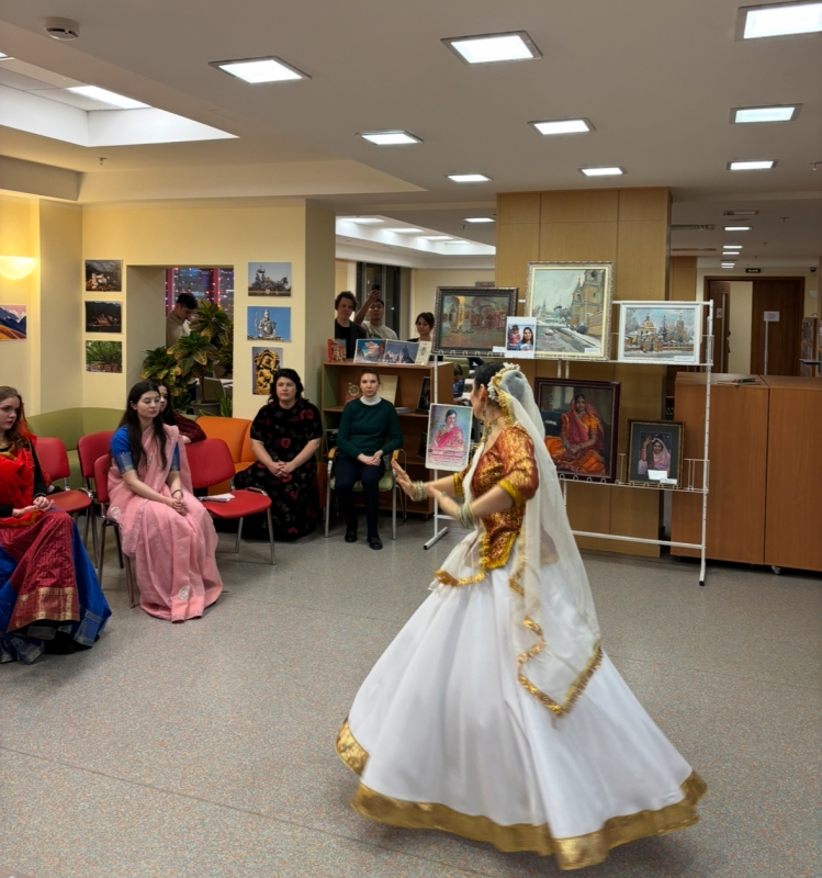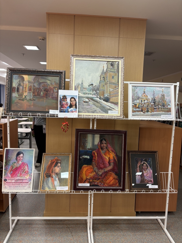 19 декабря 2025 года в Библиотечно-информационном комплексе (Ленинградский проспект, 51.1, комн. 0116 – 0117) состоялся вечер индийской культуры, приуроченный к Дню памяти Николая Константиновича Рериха, художника, философа, путешественника. Мероприятие было организовано Кафедрой гуманитарных наук Факультета социальных наук и массовых коммуникаций при участии Библиотечно-информационного комплекса. Модератором выступила Евгения Сергеевна Бужор, доцент Кафедры гуманитарных наук Факультета социальных наук и массовых коммуникаций, руководитель научного студенческого кружка «Философская Москва». Участники: –студенты кружка «Философская Москва» –магистранты факультета «Высшая школа управления» –сотрудники Кафедры гуманитарных наук –сотрудники Библиотечно-информационного комплекса. Мероприятие включало в себя три части. В первой - участники вечера посмотрели видео Манэ Аветисян (студентки 3 курса направления «Этика бизнеса»), подготовленное в рамках реализации гранта Фонда наследия русского зарубежья «Культурная работа Н. К. Рериха в Индии в 1923 – 1947 гг.» О Н.К. Рерихе, его научной деятельности, творчестве, Центрально-Азиатской экспедиции, доме семьи Рерихов в Гималаях (долине Куллу) рассказали студенты магистратуры из Индии (факультет «Высшая школа управления»). Во второй части, творческой, студенты узнали об особенностях индийского танца «катхак», о философии йоги в классическом индийском танце. Индийские классические танцы исполнила Елена Гришина, основатель школы индийского танца «Саргам» в Москве, преподаватель и танцовщица, и ее коллега Вадим Мустаев. Выразительность движений, гармония музыки и танца, четкие ритмы, яркий индийский колорит - все это вызвало огромный восторг и эстетическое удовольствие у зрителей. В заключительной части вечера состоялось открытие персональной выставки картин «Россия и Индия. Две родины» Шанти Кушвахи (является Членом Союза художников России). Художница пишет картины в разных жанрах: пейзажи (природа, городской пейзаж), портреты. Преобладающей темой в творчестве является Индия. Шанти рассказала о своем творчестве, о замысле и создании картин, представленных на выставке, о том, в каких техниках они написаны. Люди, изображенные на картинах, реальные. Шанти поделилась с участниками вечера своими впечатлениями, возникшими при посещении музея-усадьбы Рерихов в Наггаре. Иллюстративно-информационным сопровождением вечера была книжная выставка, посвященная истории и культуре Индии, подготовленная Библиотечно-информационным комплексом. Это замечательное мероприятие дало отличную возможность через искусство прикоснуться к культурным ценностям Индии.