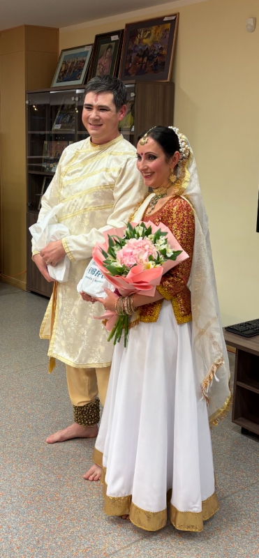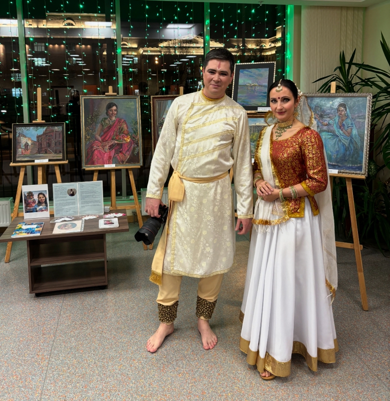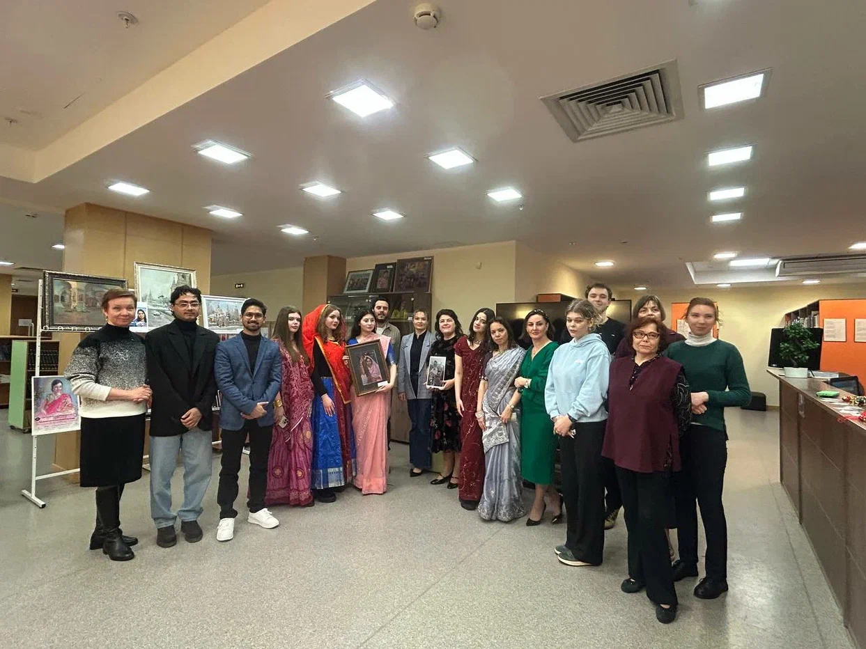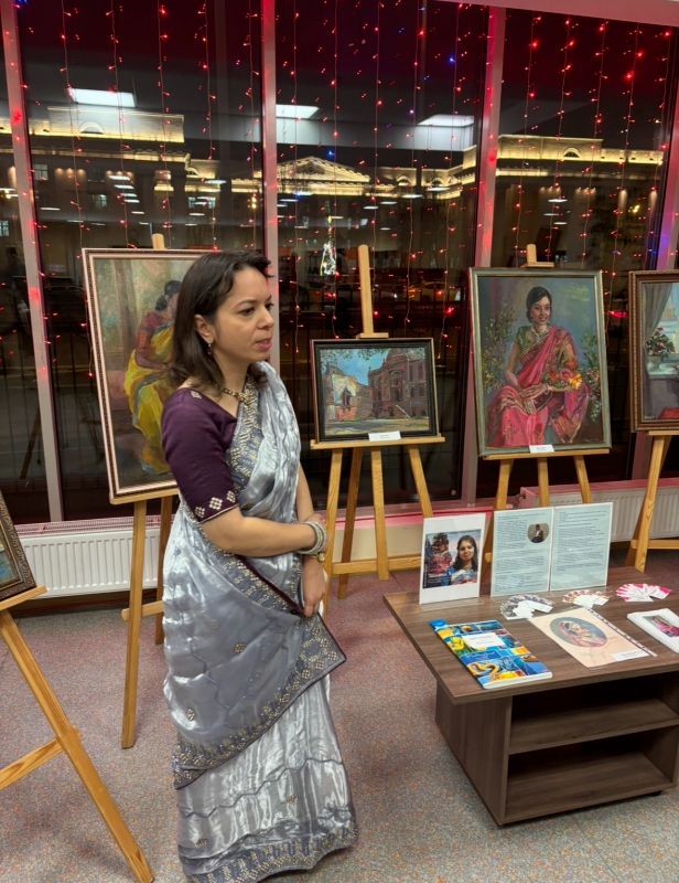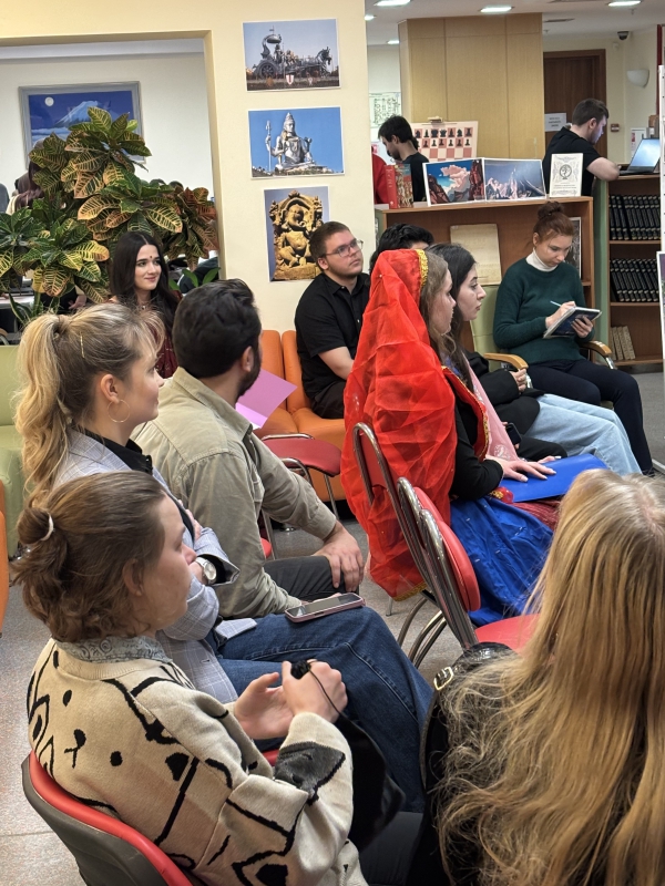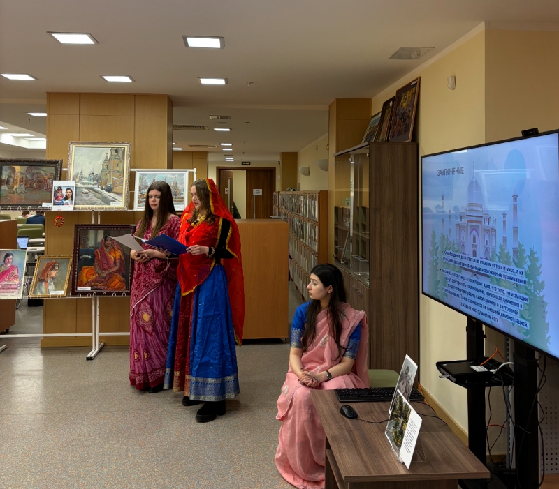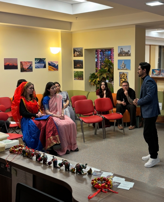 19 декабря 2025 года в Библиотечно-информационном комплексе (Ленинградский проспект, 51.1, комн. 0116 – 0117) состоялся вечер индийской культуры, приуроченный к Дню памяти Николая Константиновича Рериха, художника, философа, путешественника. Мероприятие было организовано Кафедрой гуманитарных наук Факультета социальных наук и массовых коммуникаций при участии Библиотечно-информационного комплекса. Модератором выступила Евгения Сергеевна Бужор, доцент Кафедры гуманитарных наук Факультета социальных наук и массовых коммуникаций, руководитель научного студенческого кружка «Философская Москва». Участники: –студенты кружка «Философская Москва» –магистранты факультета «Высшая школа управления» –сотрудники Кафедры гуманитарных наук –сотрудники Библиотечно-информационного комплекса. Мероприятие включало в себя три части. В первой - участники вечера посмотрели видео Манэ Аветисян (студентки 3 курса направления «Этика бизнеса»), подготовленное в рамках реализации гранта Фонда наследия русского зарубежья «Культурная работа Н. К. Рериха в Индии в 1923 – 1947 гг.» О Н.К. Рерихе, его научной деятельности, творчестве, Центрально-Азиатской экспедиции, доме семьи Рерихов в Гималаях (долине Куллу) рассказали студенты магистратуры из Индии (факультет «Высшая школа управления»). Во второй части, творческой, студенты узнали об особенностях индийского танца «катхак», о философии йоги в классическом индийском танце. Индийские классические танцы исполнила Елена Гришина, основатель школы индийского танца «Саргам» в Москве, преподаватель и танцовщица, и ее коллега Вадим Мустаев. Выразительность движений, гармония музыки и танца, четкие ритмы, яркий индийский колорит - все это вызвало огромный восторг и эстетическое удовольствие у зрителей. В заключительной части вечера состоялось открытие персональной выставки картин «Россия и Индия. Две родины» Шанти Кушвахи (является Членом Союза художников России). Художница пишет картины в разных жанрах: пейзажи (природа, городской пейзаж), портреты. Преобладающей темой в творчестве является Индия. Шанти рассказала о своем творчестве, о замысле и создании картин, представленных на выставке, о том, в каких техниках они написаны. Люди, изображенные на картинах, реальные. Шанти поделилась с участниками вечера своими впечатлениями, возникшими при посещении музея-усадьбы Рерихов в Наггаре. Иллюстративно-информационным сопровождением вечера была книжная выставка, посвященная истории и культуре Индии, подготовленная Библиотечно-информационным комплексом. Это замечательное мероприятие дало отличную возможность через искусство прикоснуться к культурным ценностям Индии.