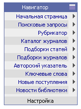 Процедура регистрации завершена! Теперь Вы можете начинать работу с системой. 5. Работа с Научной Электронной Библиотекой. 5.1. Вход в систему, общие замечания Доступ и работа с системой eLIBRARY осуществляется при помощи любого стандартного браузера, например MS Internet Explorer, через Интернет. Чтобы зайти в систему, на главной странице сайта http://www.elibrary.ru в табличке "Вход в библиотеку" укажите имя пользователя (логин) и пароль, которые Вы указали при регистрации. После чего нажмите кнопку "Вход". 5.2. Основные возможности Основные возможности становятся доступными после входа в систему, перечень их отражается в табличке "Навигатор" (слева, под информацией о Текущей сессии). Меню "Навигатора" является настраиваемым, т.е. Вы можете включать или исключать из него пункты и разделы по Вашему усмотрению. Рассмотрим наиболее важные разделы меню "Навигатор". Поисковые запросы - здесь осуществляется поиск со множеством настроек. Вы можете искать необходимые статьи наиболее удобным для Вас способом. Рубрикатор - содержит тематический рубрикатор изданий в системе, т.е. разбиение журналов и статей по разделам (философия, социология, математика и т.д.) Каталог журналов - база описаний и выпусков научных журналов, имеющихся в системе eLIBRARY. Обращаем Ваше внимание, что доступ для Финансового университета открыт далеко не ко всем полнотекстовым статьям из этого списка (перечень доступных ресурсов приведен выше). Подборки статей - удобный инструмент для повышения эффективности Вашей работы с системой. Подборка статей это личная "электронная книжная полка", куда Вы можете "добавлять" статьи, найденные в процессе поиска. Подборок у пользователя может быть несколько, каждой можно дать отдельное название, удалить, добавить/убрать статьи в подборке и т.д. Подборки журналов - инструмент, аналогичный описанной выше подборке статей, с разницей, что на эту "книжную полку" Вы можете добавлять списки требуемых журналов. Использование подборок журналов облегчает процесс поиска путем отсеивания заведомо не нужных результатов. Пример использования Другим важным аспектом применения подборок статей является возможность поиска ТОЛЬКО среди тех ресурсов, на которые у Финансового университета оформлена подписка. Иными словами, возможность искать только среди статей, которые Вы можете скачать в электронном виде прямо с сайта eLIBRARY. Подробнее см. раздел 5.3. Авторский указатель - база данных авторов статей, содержащихся в системе. Здесь Вы можете по фамилии автора узнать о его статьях, и в каких журналах они опубликованы. Ключевые слова - разновидность специального поиска по ключевым словам, содержащимся в библиографических записях ресурсов eLIBRARY. 5.3. Поиск в базах данных eLIBRARY Поиск осуществляется в разделе "Поисковые запросы" путем ввода в форму параметров поиска и нажатия кнопки "Поиск". Обратите внимание, что запросы можно сохранять для последующего использования или модификации. После указания параметров поиска нажмите внизу кнопку "Сохранить как". Сохраненные запросы добавляются в выпадающий список (справа от кнопки "Поиск"). В поисковой форме вводить непосредственно вручную Вы можете только ключевые слова (поле "Слова из текста"), остальные параметры вы можете только выбирать из списка фиксированных значений. Настройка системы на поиск ТОЛЬКО среди ресурсов, на которые о
